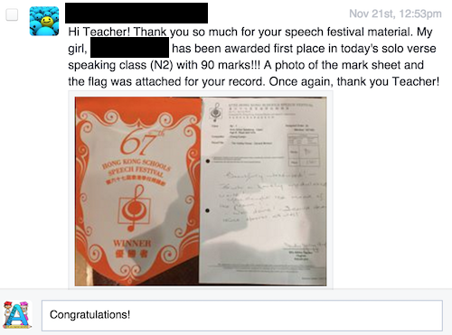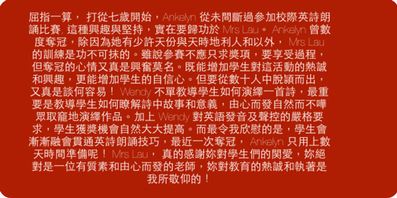 再者,Mrs. Lau在朗誦的演繹尤是出神入化。得到Mrs. Lau的正規指導下,我幼女兒在小學時期每年度的英文朗誦比賽都獲得冠、亞軍的優越成績。Mrs. Lau 不但在音準、聲調上給予學生適當的指引,更講究神韻的表達。她會給學生講解詩中故事的背景,人物的情緒等等,讓他們都能融入角色,朗出韻味。