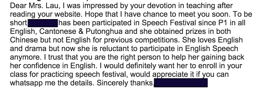 我兩位女兒分別就讀瑪利諾修院學校及拔萃女書院。自幼便跟隨Mrs. Lau學習英文寫作、英國文學,至今已十多年。在她悉心的教導下,我女兒的英文水準尤見卓越。長女在去年第一屆中學文憑試(DSE)英文科考試取得5*的優良成績。次女更在英國文學科獲得A級的校內評級,令人鼓舞。