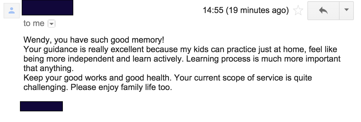 We do not take credit for the success of these students - we merely do our best to nurture the students' own talent. We thank these parents for their kind comments, though.